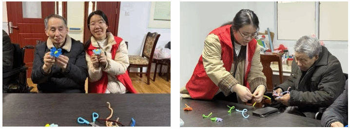 活动中,志愿者结合老年人动手能力,选取简单易学的小花戒指作为制作内容,分步演示制作方法,放慢动作、简化流程,反复讲解扭、折、绕等关键步骤。针对行动不便、动手能力较弱的老人,志愿者主动提供一对一帮扶,手把手全程指导、细心照料。老人们参与热情高涨,拿起色彩鲜亮的扭扭棒积极创作,过程中与志愿者交谈甚欢,普通扭扭棒在老少默契配合下,化身成精致的手工作品,现场氛围温馨和睦。