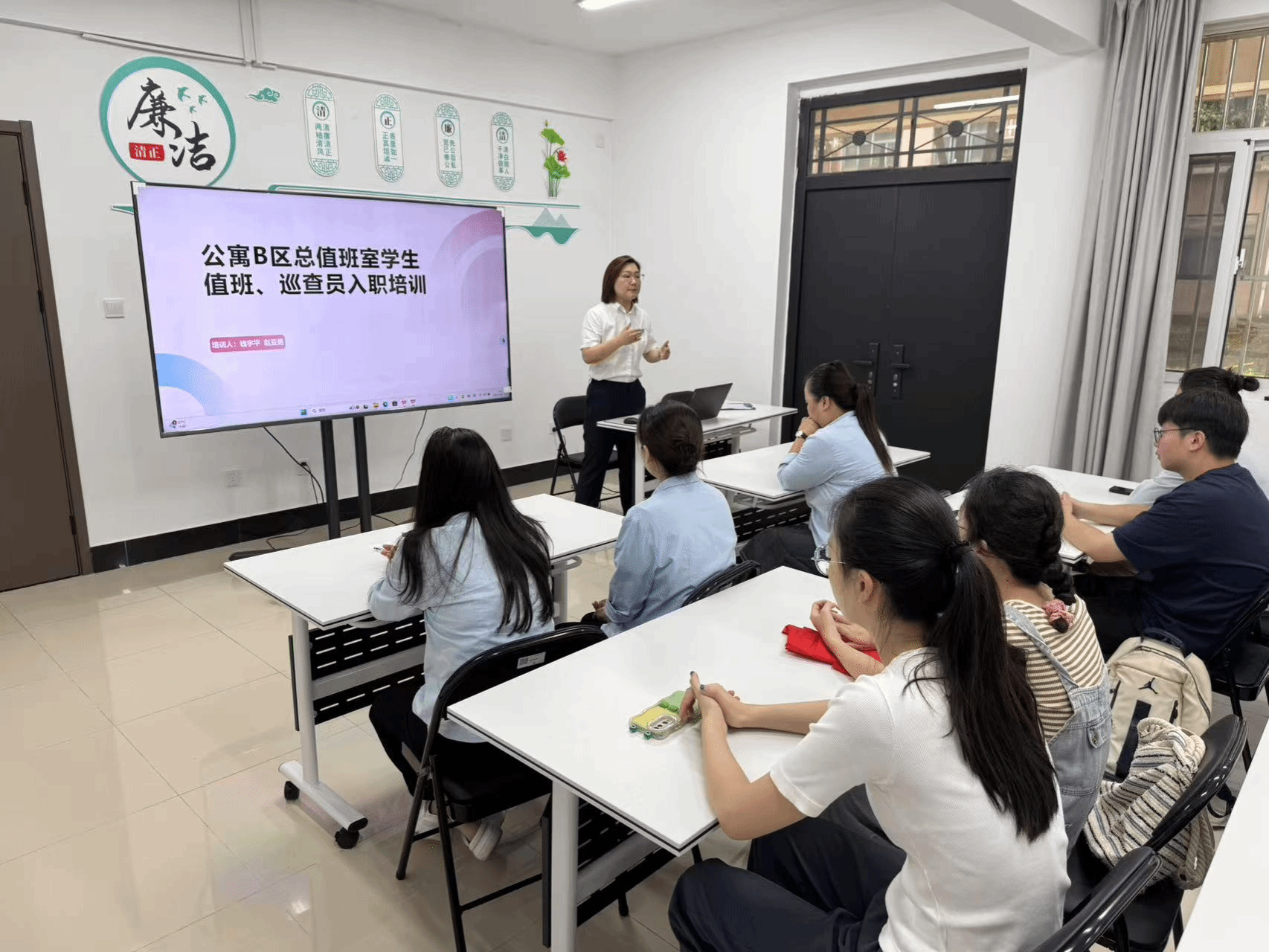 为进一步强化学生自治管理效能,筑牢楼栋安全防线,提升学生责任意识与实操能力,9月21日,财经学院联合毓秀书院、后勤服务中心开展自治楼栋值班员专项培训。财经学院党委副书记、副院长刘群东、后勤服务中心赵亚男及全体新任楼栋值班员参加了此次培训,共同为打造安全、有序、温馨的书院生活环境蓄力赋能。