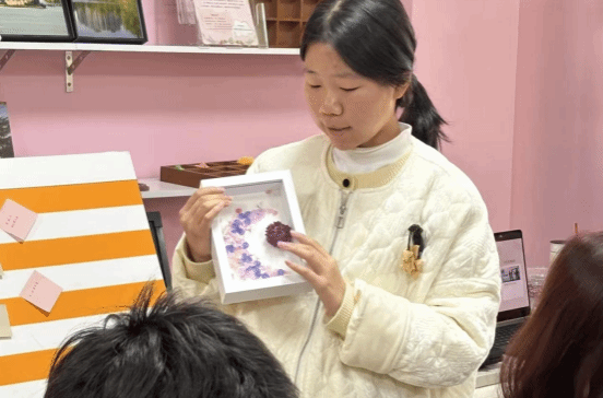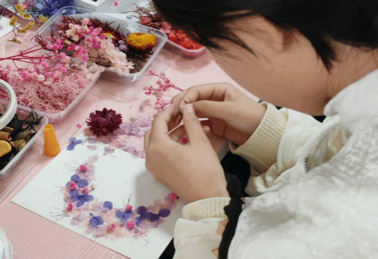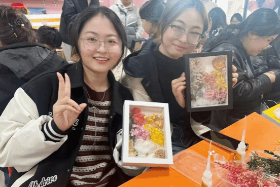 “干花疗愈”情绪疏导环节以小组形式开展,现场整齐摆放着各色干花、相框与工具,暖意融融。同学们静下心来挑选花材,依据内心感受搭配色彩与造型,凭借花材的色彩层次与造型设计实现情感视觉化呈现。在裁剪、拼接、固定的正念实践中,大家既提升了动手能力、陶冶了情操,更将繁杂思绪转化为创作灵感,在释放负面情绪的同时具象化自我价值。