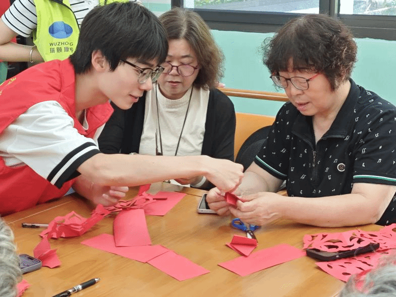 实践团队首站走进尚友社区居家养老服务中心,开展“剪映烽火,纸载丹心”主题活动。青年学子与社区老人围坐一堂,将非遗剪纸艺术与红色教育相融合。在讲解剪纸技艺、共同创作红色主题作品的过程中,队员们认真倾听老人们亲历的革命岁月故事。