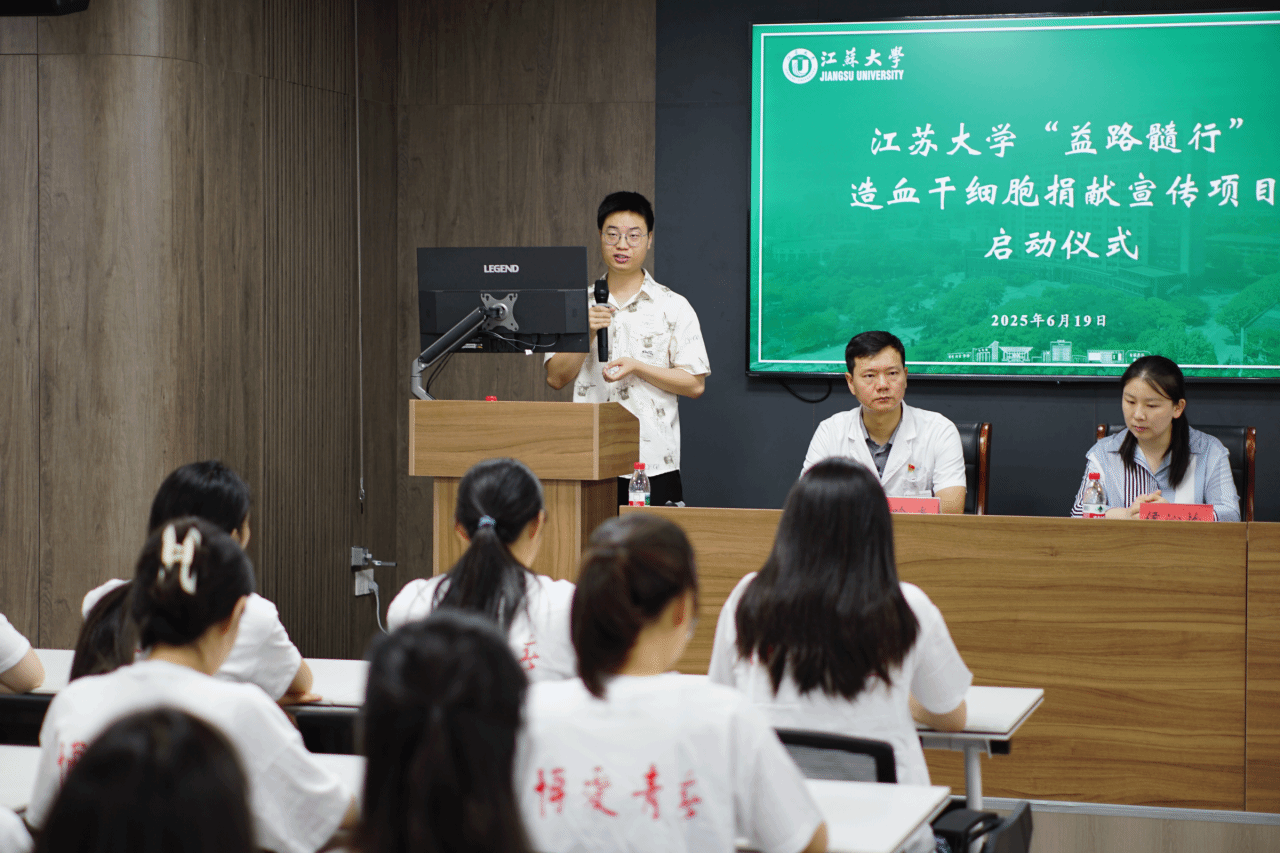 6月19日,江苏大学“益路髓行”团队在三江楼1301报告厅举行“博爱青春”项目启动仪式。镇江市红十字会捐献工作部副部长侯沁怡,财经学院党委副书记、副院长刘群东,财经学院团委书记张明亮,镇江市第69例造血干细胞捐献者杨吟光,镇江市第122例造血干细胞捐献者蒋文昭及团队90余名志愿者参加活动。
